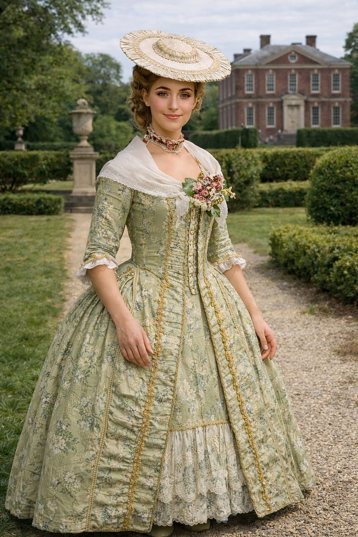 We have chosen to put Polly outside in a garden, and have given her a hat to go with her ensemble. Unfortunately, due to the polishing process on Picsart, the modern makeup artifact has been included, and thus we should note that such makeup would not have been worn during Polly’s era.