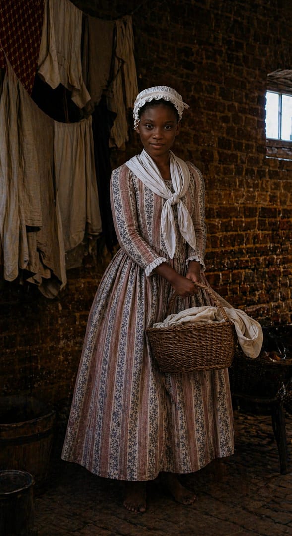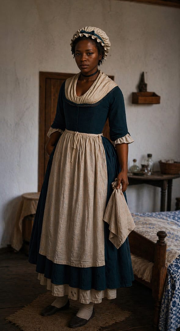 Wealthier households sometimes dressed enslaved domestic servants in cleaner or more fashionable clothing to reflect the household’s status, although these garments were still controlled by enslavers and were usually made from inexpensive materials. Research from Colonial Virginia- such as published in Encyclopedia Virginia in an article contributed by Katherine Egner Gruber- notes that enslaved women and girls often wore combinations of shifts, petticoats, jackets, kerchiefs, and caps, while children sometimes went barefoot, especially when young (2).