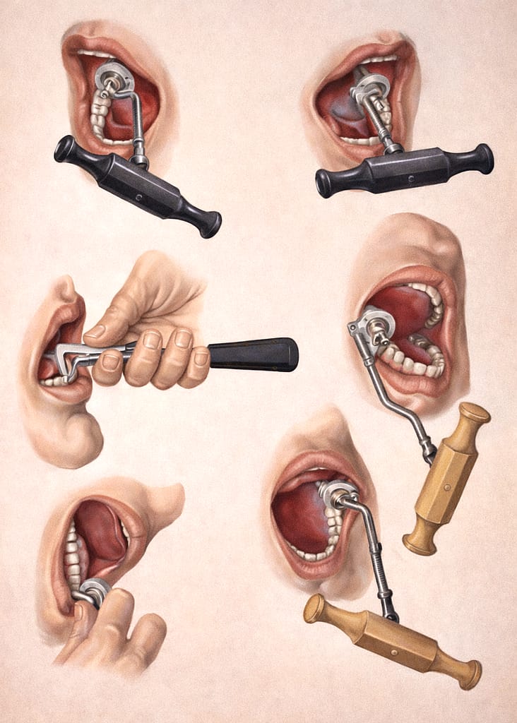 Also known as the Clef de Garengeot, Fothergill Key, English Key, or Dimppel Extractor, Alexander Monro first mentioned the tooth key in his book “Medical Essays and Observations” in 1742. However, it likely had been used since around 1730.