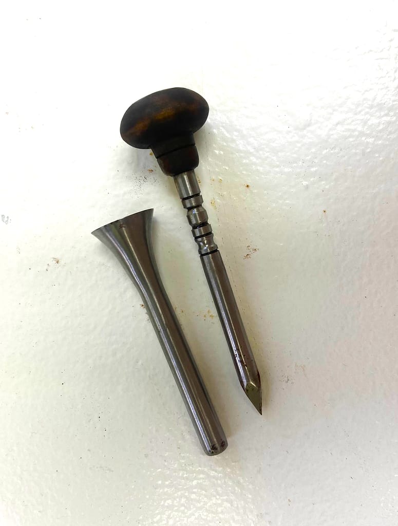 This tool, called a trephine, was used to cut a precise circular hole in bone– especially in the skull. The trephine had a short metal cylinder with a sharp edge and a turning handle that allowed it to “core” out a round piece of bone.