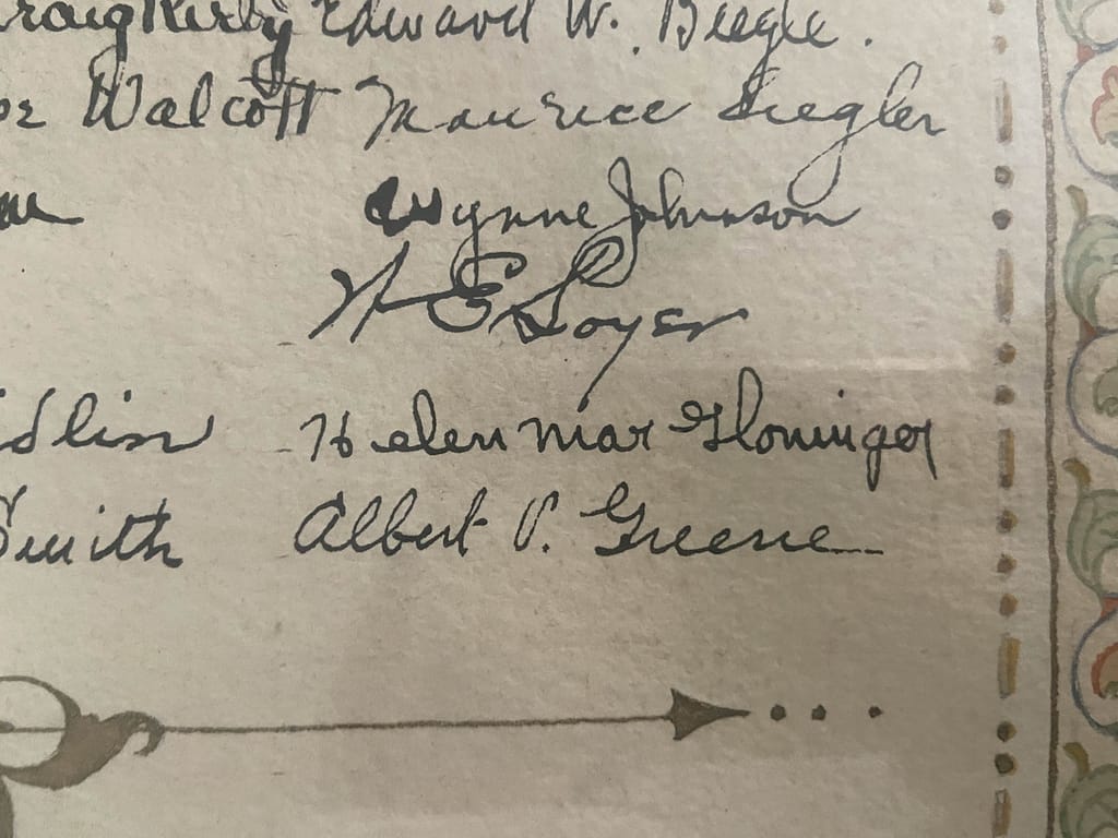 At the very bottom corner of the document, we see a list of names signed by the students, and one name stands out too: Albert V. Greene.