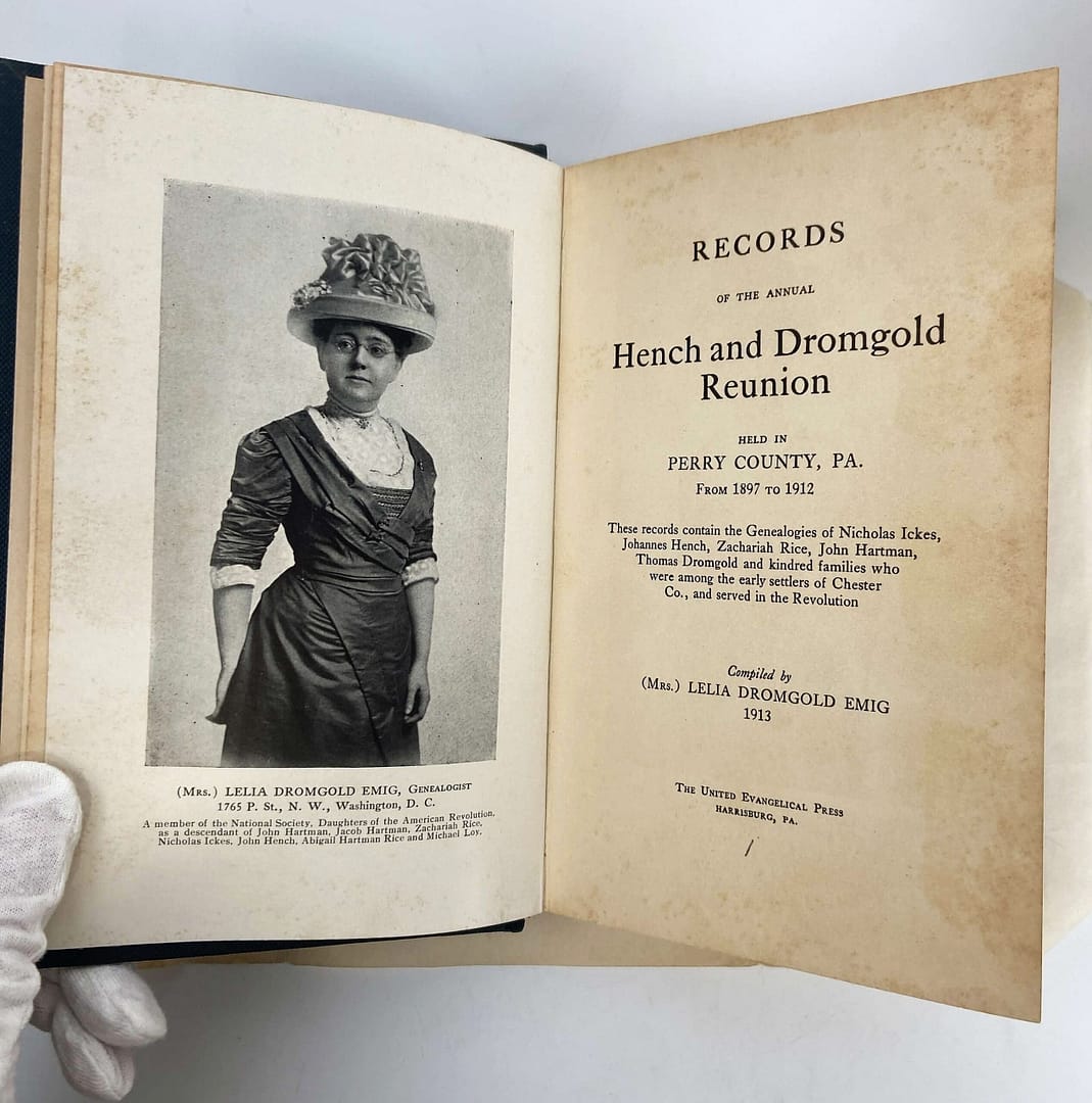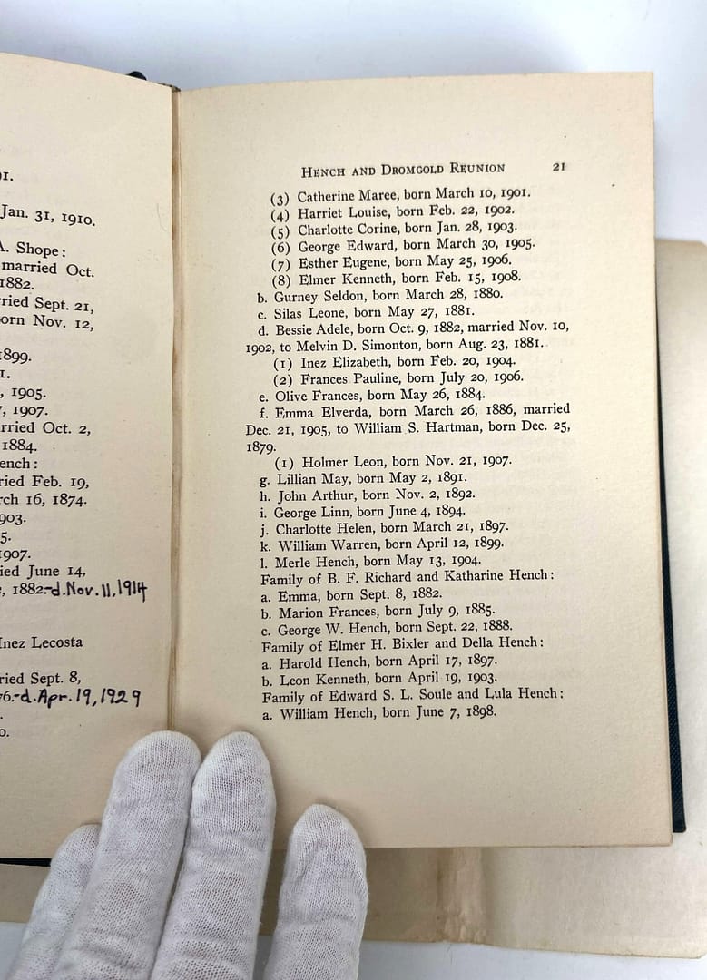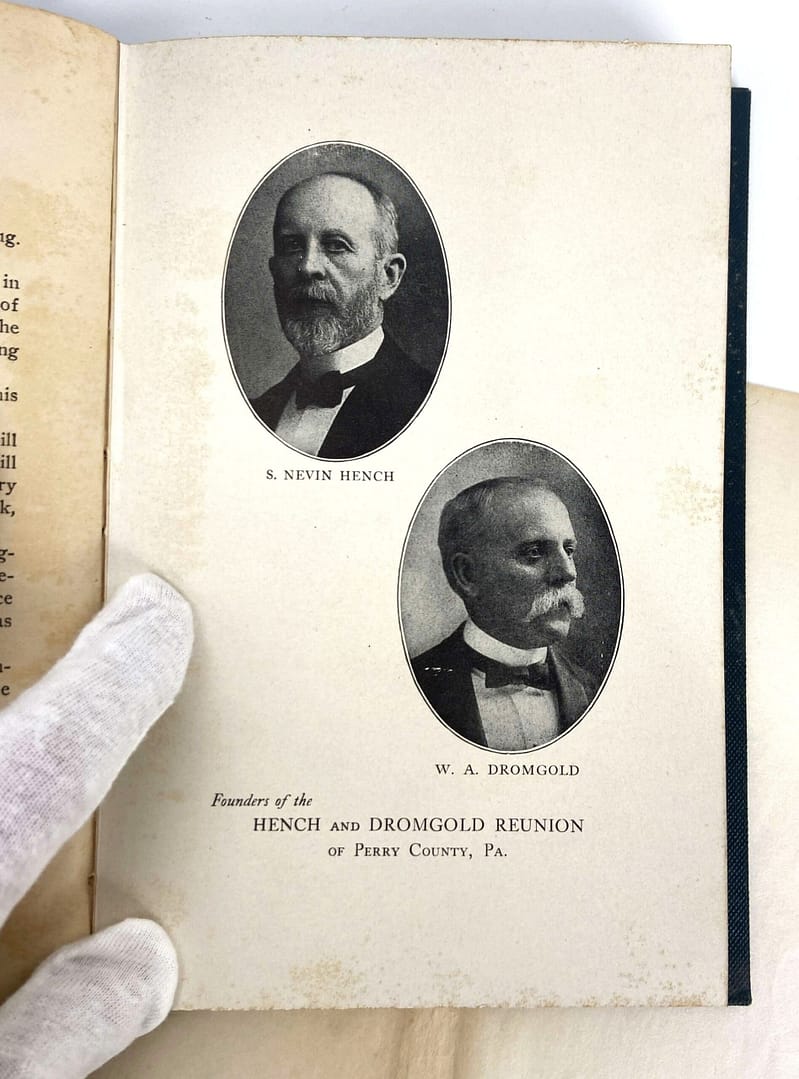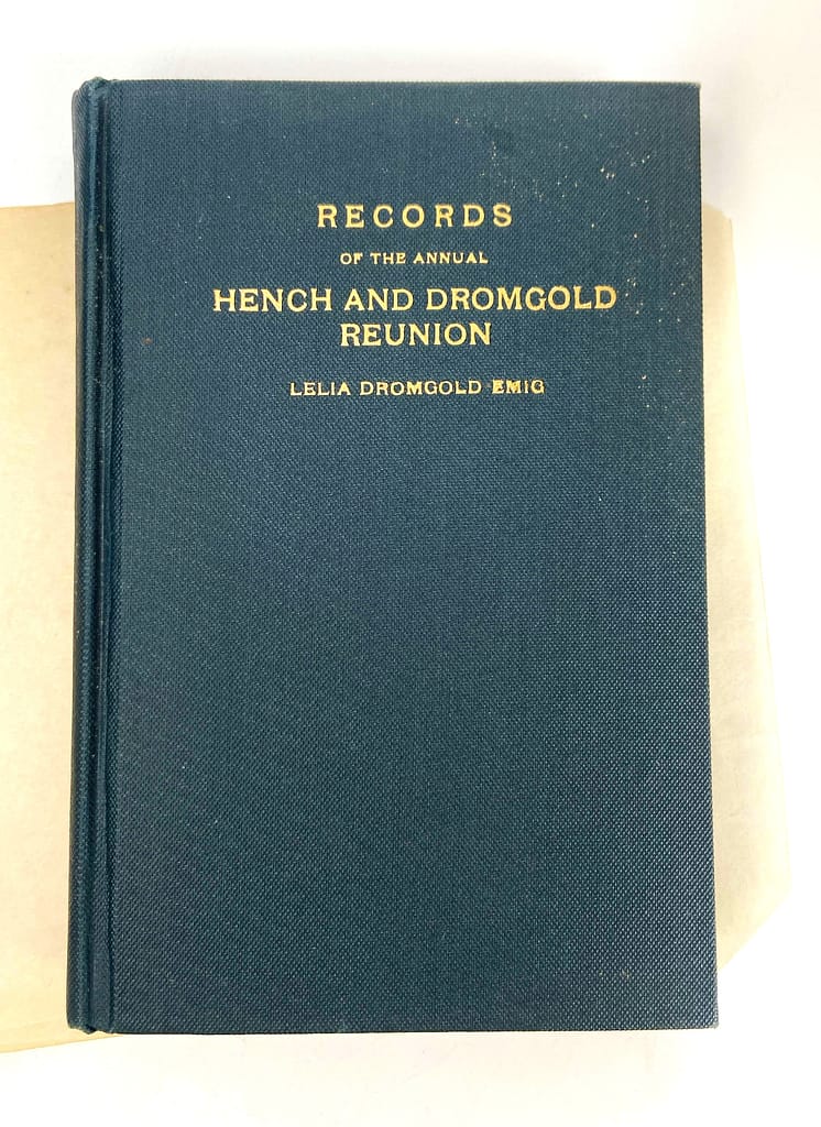 The front cover clues us in a bit about what this book actually is: an account of the Records of the Annual Hench and Dromgold Reunion. Credited to Mrs. Lelia Dromgold Emig, this book also comes with a note on the inside pages.