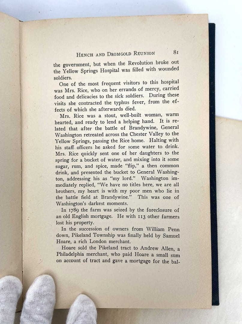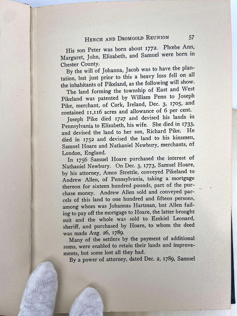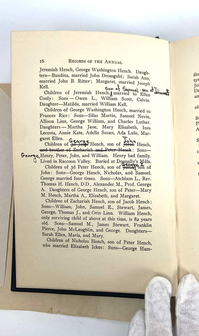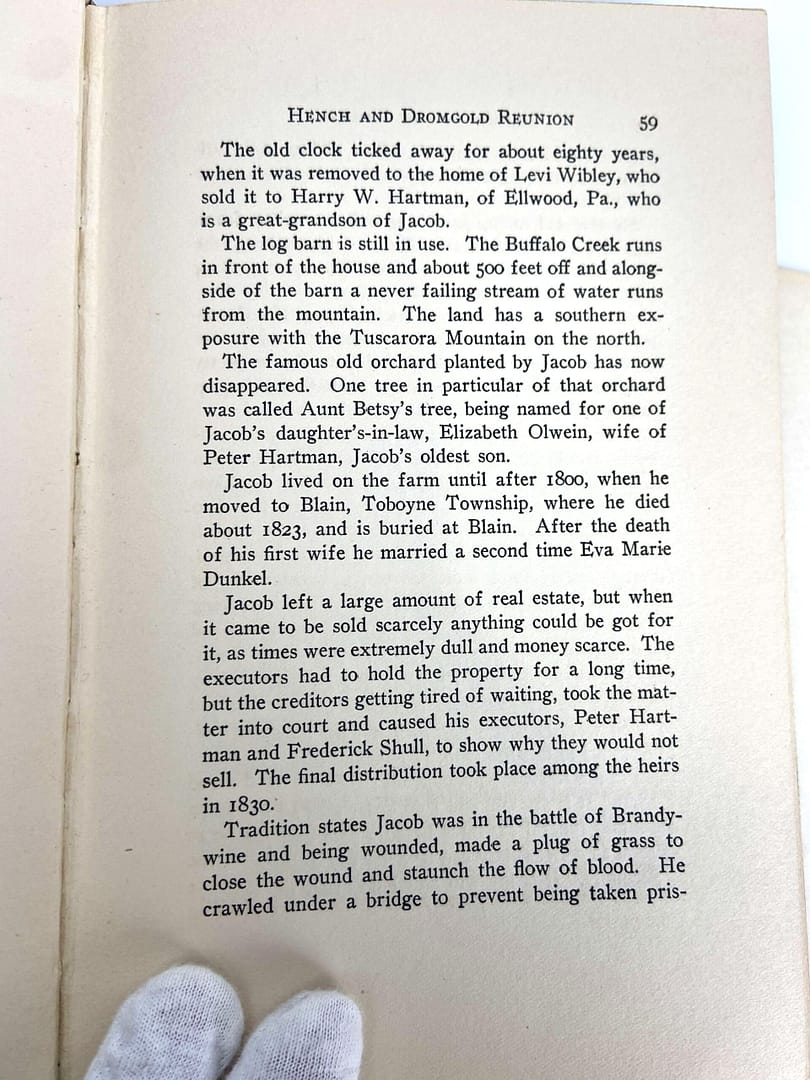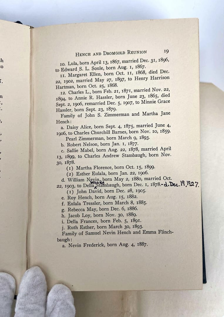 The front cover clues us in a bit about what this book actually is: an account of the Records of the Annual Hench and Dromgold Reunion. Credited to Mrs. Lelia Dromgold Emig, this book also comes with a note on the inside pages.