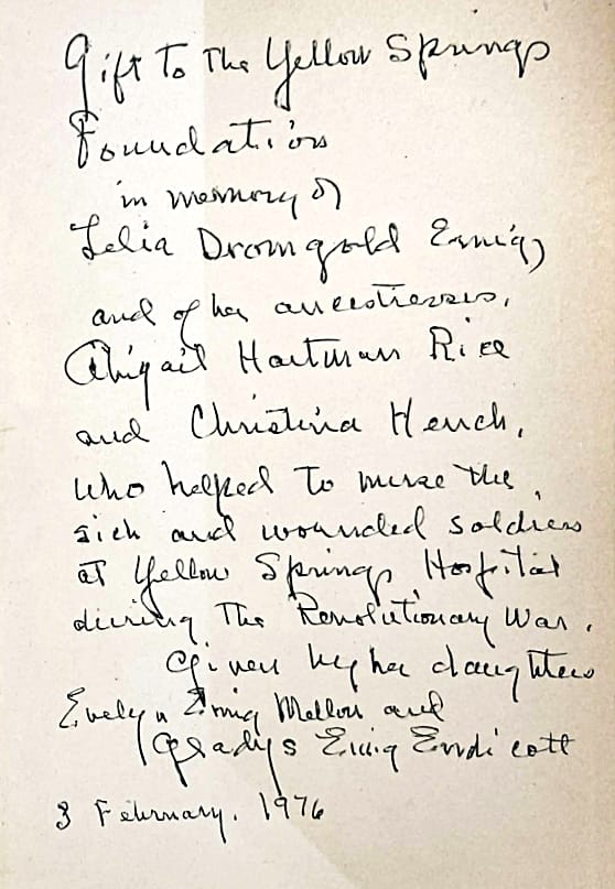 In Memory of Lelia Dromgold Emig, and her ancestresses, Abigal Hartman Rice and Christina Hench, Who helped to nurse the sick and wounded soldiers at Yellow Springs Hospital [Washington Hall] during The Revolutionary War.Given by her daughters, Evelyn Emig Mallors and Gladys Emig Endicott