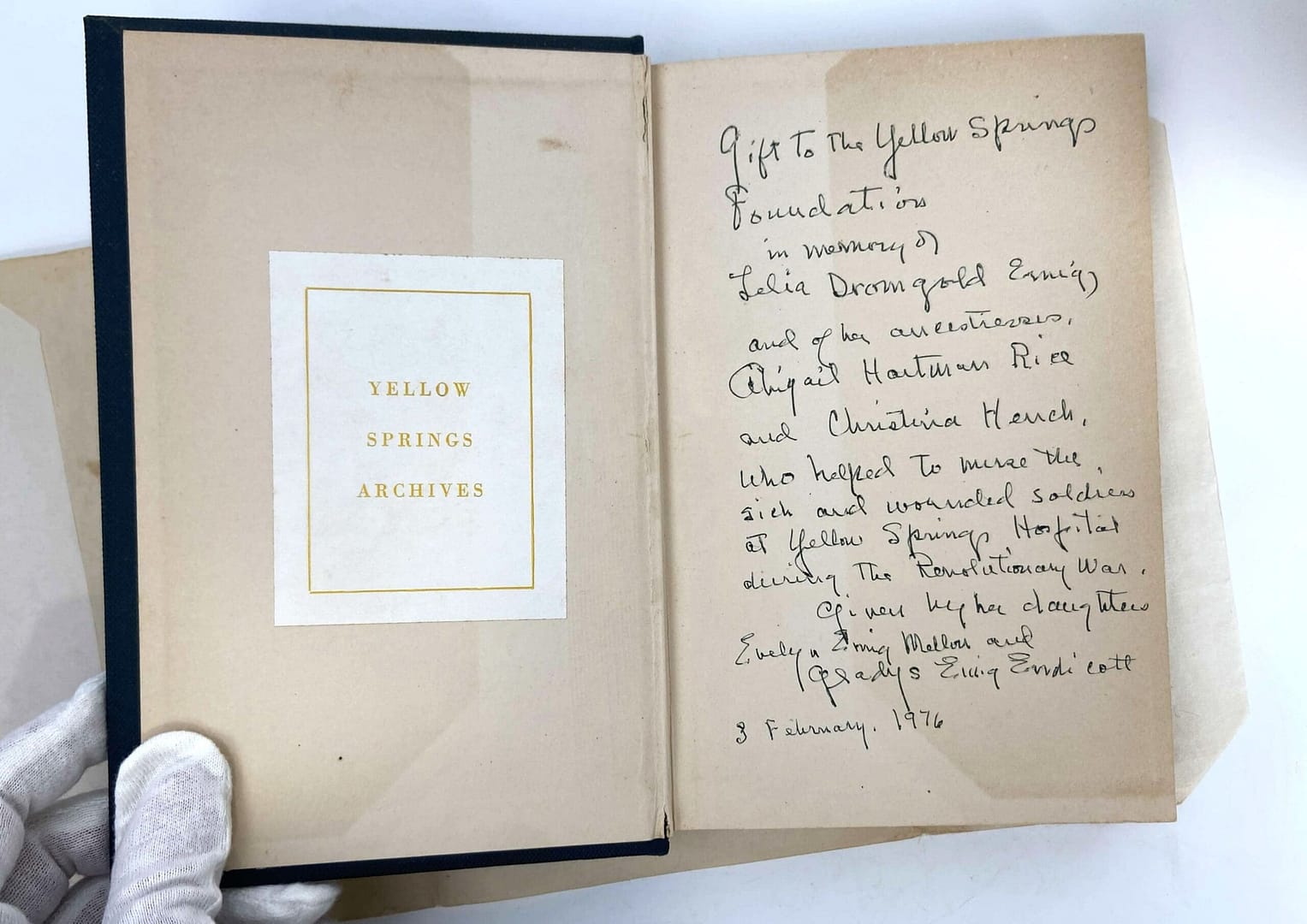 In Memory of Lelia Dromgold Emig, and her ancestresses, Abigal Hartman Rice and Christina Hench, Who helped to nurse the sick and wounded soldiers at Yellow Springs Hospital [Washington Hall] during The Revolutionary War.Given by her daughters, Evelyn Emig Mallors and Gladys Emig Endicott